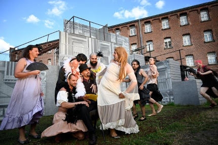 Szene aus "Dreigroschenoper". Foto: Thomas Aurin "Großartig, geradezu überwältigend", schwärmt Jakob Hayner in der Welt von der "Dreigroschenoper", die der Verein AufBruch unter der Regie von Peter Atanassow mit Häftlingen der JVA Tegel auf die Bühne gebracht hat. In ihrer "rauen Schönheit" besticht die Inszenierung noch mehr als jüngste Varianten von Wilson, Kosky oder Ostermeier, lobt der Kritiker: "Das Bühnenbild von Holger Syrbe bietet mit seinen zahlreichen Türen und Treppen viele Möglichkeiten für spektakuläre Auftritte, die für Operettenatmosphäre sorgen. Die aufgemalten Fassaden mit ihren unvergitterten Fenstern und Feuertreppen schaffen einen deutlichen Kontrast zur baulichen Umgebung. Für das Hurenhaus, in dem Mackie Messer regelmäßig absteigt, werfen sich die harten Jungs aus dem Knast in feine Frauenkleider - Kostüme: Anne Schartmann -, kräftige Männerarme mit Tätowierungen ragen unter Rüschen hervor. Das Publikum jubelt. Plötzlich ist man in der unglaublichsten Travestieshow Berlins gelandet, Röcke werden gehoben, Beine geschwungen. Die entfesselte Spielfreude der Darsteller ist kaum zu bremsen."