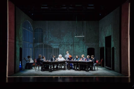 Szene aus "Der Zauberberg". Foto: Laura Vanseviciene Die polnische Regie-Legende Krystian Lupa hat mit dem Ensemble des Jaunimo Teatras aus Vilnius Thomas Manns "Zauberberg" auf die Bühne der Salzburger Festspiele gebracht, ganze fünfeinhalb Stunden lang in litauischer Sprache - und die TheaterkritikerInnen ächzen. "Alles spielt sich - bis auf ein paar Wege durch das Parkett - in einem raumhohen Kubus ab, dessen drei Wände mit wechselnden Projektionen bespielt werden", stöhnt Margarete Affenzeller im Standard nach vielen "verlangsamten, zerdehnten Szenen". Bilder kann Lupa, konstatiert Egbert Tholl in der SZ, aber er wolle einfach zu viel - einerseits "große Thomas-Mann-Exegese", andererseits diene ihm der Text "nur als Vorwand für ein Untergangsgemälde, für einen imposanten Bilderrausch des Weltenwahnsinns. Was Naphta, Peeperkorn, Krokowski, Settembrini und alle anderen Unternehmer in den jeweils eigenen Gefilden des Geistes zu sagen haben, verkommt immer mehr zu einem Raunen angesichts des Weltenbrands. Bei der Séance gegen Ende, wenn in einer hoch albernen, aber nie albern gemeinten Splatter-Nummer der Geist des toten Ziemßen beschworen wird, taucht der auch tatsächlich auf. In KZ-Kleidung."