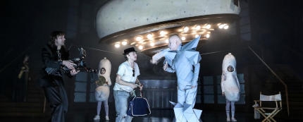 Szene aus "Munich Machine". Foto: Birgit Hupfeld Nicht besonders glücklich wirdNachtkritikerin Susanne Greiner mit Ersan Mondtags Inszenierung von Albert Ostermaiers "Munich Machine" am Münchner Residenztheater. Denn das Stück, in dem Ostermaier den Regisseur KlausLemke reinkarnieren lässt, der dabei zusieht, wie Münchner Utopien in den vergangenen Jahrhunderten scheiterten, ist zwar unglaublich witzig, aber Mondtag kriegt es nicht ganz in den Griff, so Greiner: "Weil Mondtag nicht den Faden findet, um sie stringenter zu binden. So wirken die 'Utopien' teils nur lose aneinandergereiht. An manchen Stellen hätte Mondtag den Text auch kürzen können, beispielsweise bei den beiden Anfangsmonologen von Lemke und Münchner Kindl."