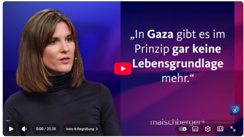 Diese Aufstellung zeigt auch, dass Sophie von der Tann lediglich ein kleiner Teil eines Systems ist, in dem die Hamas seit dem 8. Oktober 2023 als Akteur praktisch nicht mehr vorkommt. Ein System, in dem Falschmeldungen (etwa israelische Angriffe auf ein "Lager", das nicht existiert, mehr bei U.M.) nicht korrigiert werden und immer zulasten Israels (mehr hier) ausfallen, und in dem das Hamas-Pogrom genutzt wird für eine kontinuierliche Abrechnung mit der Regierungspolitik Israels. Ein besonders verachtungswürdiges Beispiel lieferte dann doch von der Tann selbst in der Sendung ihrer späteren Chefjurorin für den Friedrichs-Preis Sandra Maischberger. Die Aussage von der Tanns "In Gaza gibt es keine Lebensgrundlage mehr", die ein unmittelbar bevorstehendes Massensterben suggeriert, dient auf YouTube als Aufmacher für das Video der Maischberger-Sendung. Sie ist ein Beispiel für die Mischung einer in dieser Form faktisch unzutreffenden Aussage (um die 99 Prozent der Einwohner Gazas leben auch ein Jahr nach diesem Satz noch dort), um das gewünschte Narrativ eines Genozids zu befeuern, und einer impliziten einseitigen Schuldzuweisung (hier das Video der ganzen Sendung).