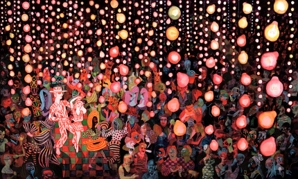 Vor allem aber unterscheidet sich "Les Rigoles" von den Schraffuren und Fratzen auf den Buchseiten von Ferris, weil es ein anmutiger Comic ist. Krankhaft anmutig, das heißt: beinahe zu schön, zu bunt, zu schillernd, zu gekonnt; eine fluide Welt der Choreografien und Ornamente und der perfekten Wimmelbilder, in denen sich die Figuren verlieren. Dass den Figuren Farben zugeordnet sind: Blau, Rosa, Giftgrün, Zinnober, ermöglicht es, sie wiederzufinden und die Worte, die in denselben Farben auf dem Papier stehen, mit Gesichtern und Gestalten zu verknüpfen.