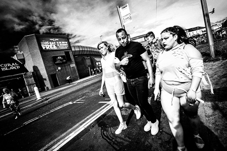 Als Suchodrev in Blackpool ankommt, verfällt sie sogleich der bizarren Atmosphäre der Feiermeile, wirft sich mit ihrer Kamera ins Getümmel. Sie folgt der endlosen Prozession entlang der Strandpromenade, macht sich ihren Rhythmus zu eigen: akut, unablässig, von fiebriger Lethargie erfasst. Die kontrastreichen Schwarzweißfotos, die dabei entstehen, sind geleitet von der hoch stehenden Sonne, die an Körpern, Kinderwägen und Laternenmasten Schlagschatten wirft, und deren gleißendes Licht die Spuren der vergangenen Nacht aus den Gesichtern brennt.