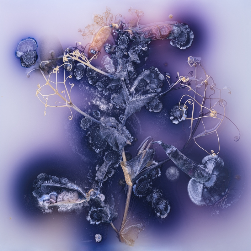 Der Arbeitsprozess ist zeitintensiv und aufwändig: Die Blumen werden aufgehängt, getrocknet, entstaubt, gewendet, besprüht, in Wasser getaucht, mit selbst hergestellter Pflanzentinte bearbeitet. "Während des Trocknungsprozesses extrahiere ich die wasserlöslichen Pigmente der Pflanzen. Anschließend tauche ich sie in ein flüssiges Medium, in dem sie sich entfalten können. Manchmal füge ich die extrahierte Blütenfarbe hinzu, die sich in wirbelnden Ranken verteilt. Das Zusammenspiel von Farbe und Form wird zu einem Tanz, der zugleich die verborgene Alchemie aller lebenden Materie offenbart."