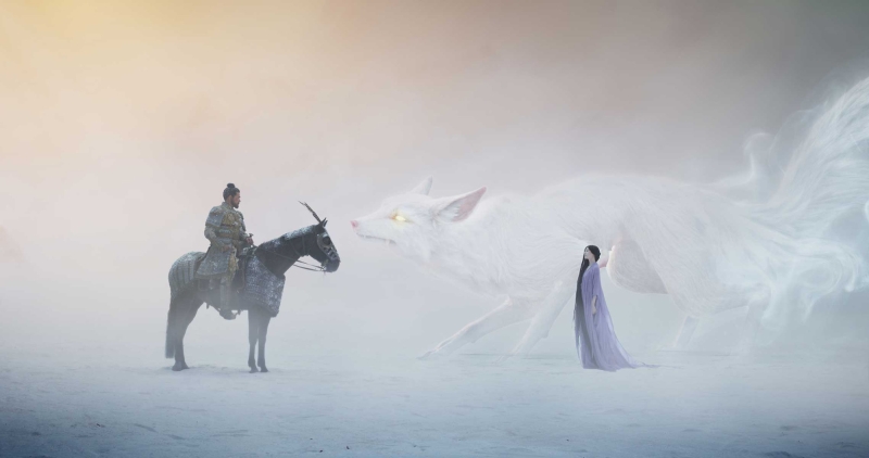 Jede Geste der Repräsentation birgt ihre Destruktion bereits in sich. Freilich nur, weil ein, zwei Drehbuchwendungen später eine Gegenrepräsentation errichtet werden will. Im Ergebnis heißt das: nichts und niemand kommt zur Ruhe. Schon gar nicht, wenn der Fuchsdämon im Frauenkörper ins Spiel kommt. Shou steht, so scheint es, ganz im Bann dieser luftig bekleideten, schlanken, übernatürlichen Femme Fatale, die sich auf allen Vieren an die Kamera heranschlängelt und dem neuen Herrscher der vier chinesischen Himmelsrichtungen die Wunden leckt, wodurch diese sich wie durch Zauberhand (oder eben: Zauberinnenzunge) schließen. Gelegentlich entströmt der Dämon ihrem Körper, die aggressive Raubtierweiblichkeit materialisiert sich als fauchender, schneeweißer CGI-Fuchs…