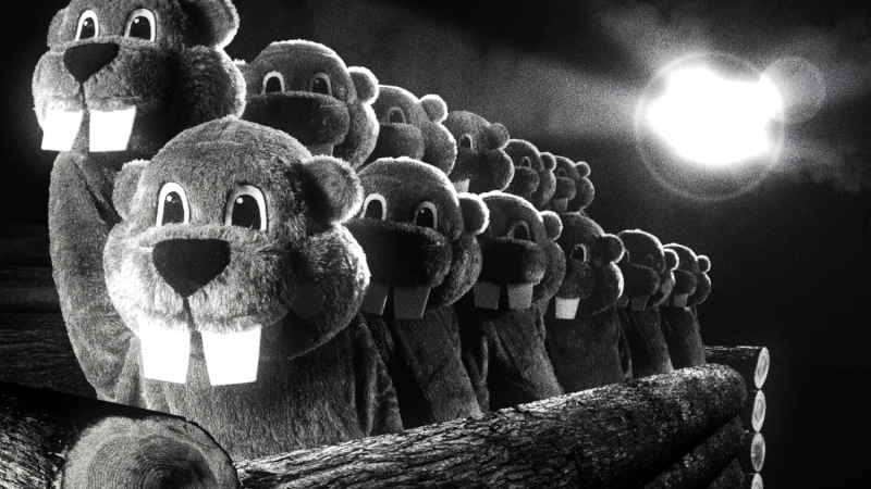 Wie in einem Point-and-Click-Adventure muss er die absurden Wege finden, die zum Erfolg führen, wie in einem Jump 'n' Run muss er im Fluss von Holzblock zu Holzblock springen und ähnliches. Diese Computerspielemulation fühlt sich aber nie wie ein "Let's Play" an, also wie ein Video, in dem man jemand anderem beim Gamen zuschauen kann, sondern ist sichtlich nicht nur von Spielen, sondern auch von Slapstick-Komödien und "Roadrunner"-Cartoons inspiriert. Unsere Hauptfigur bringt - abgesehen von einem "Pardon?" - nur Ahs und Ohs über die Lippen. Seine Aufgaben erhält Jean über Zwischentitel und Anzeigetafeln. Gerade zu Beginn wirkt er wie eine bärtige Version von Wile E. Coyote. Wilder Plan wird auf wilden Plan gepackt, um ein Tier zu fangen, und doch scheint alles zum Scheitern verurteilt. Wobei die Niederlagen als Running Gags und absurde Variationen des ewig Gleichen vollzogen werden. Jean bildet den perfekten Avatar für einen Gamer, der bei einem neuen Spiel bei den ersten Gehversuchen ordentlich durchfrustriert wird, und "Hundred of Beavers" wird zur Komödie über die bittere Erfahrung, sich alleine durch die Trostlosigkeit eines absurden Lebens schlagen zu müssen.