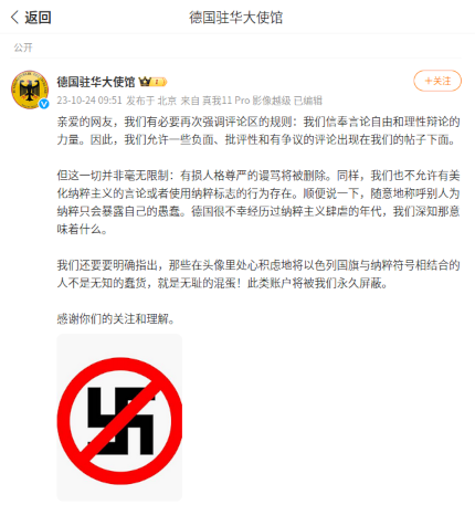 Erstaunlich: Dies hier ist ein Statement der deutschen Botschaft in Peking auf der chinesischen Internetplattform Waibo. Es wendet sich gegen gewisse Ausschreitungen in den Kommentaren unter Botschaftsbeiträgen, besonders Gleichsetzungen moderner Staaten mit Nazis, die in China offenbar gerade in Bezug auf Israel en vogue sind. Mit Deepl übersetzt liest sich der letzte Absatz des Statements so: "Wir möchten auch klarstellen, dass diejenigen, die sich die Mühe gemacht haben, die israelische Flagge mit Hakenkreuzen in ihren Avataren zu kombinieren, entweder ignorante Idioten oder schamlose Bastarde sind! Solche Konten werden von uns dauerhaft gesperrt. Wir danken Ihnen für Ihre Aufmerksamkeit und Ihr Verständnis."