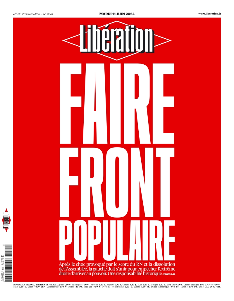 Titel der Libération heute.Macrons Coup führt in Frankreich zu eine bizarr anmutenden Diskussion über eine neue "Volksfront", die wie einst unter Léon Blum gegen die extreme Rechte einstehen soll - wobei das Problem ist, dass die größte antisemitische Kraft heute die "linke" "France Insoumise" unter Jean-Luc Mélenchon ist. In Le Mondemeldet sich bereits eine Gruppe prominenter Autoren und Schauspieler: "Nur die Vereinigung der Linken und der Umweltschützer kann dieser schrecklichen Perspektive entgegenwirken und die Hoffnung auf ein besseres Leben eröffnen. Nur dieser Zusammenschluss kann die Volks- und Mittelschichten in den Städten und Vorstädten, Dörfern und Metropolen vereinen, wie es in der Vergangenheit geschehen ist. Nur dieser Zusammenschluss kann angesichts der dreifachen Notlage - klimatisch, sozial und demokratisch - ernsthaft handeln."