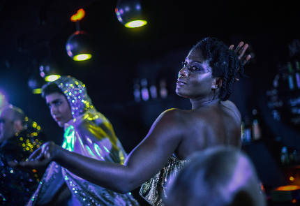 Szene aus "Tram 83". Foto: Christian Kleiner Das Highlight der Mannheimer Schillertage ist für SZ-Kritiker Egbert Tholl ohne Frage Carina RiedlsInszenierung von Fiston Mwanza Mujila "Tram 83" - wo ihn fünf Dragqueens in einer Disko empfangen: "Sie erzählen von Sex und Gier - 'in der afrikanischen Literatur muss gefickt werden, sonst wird wieder nur ein Essay daraus' -, von zwei Freunden, einer ein idealistischer Schriftsteller, der andere der König vom Tram 83, der Bar, dem Puff, dem Drogenumschlagplatz. Mujila, geboren 1981 in Lubumbashi in der Demokratischen Republik Kongo, entwirft eine hitzige Zukunftsvision eines Afrikas, in dem längst alles Leben nach den Gesetzen des Kapitalismus funktioniert, die Menschen ihre Bedürfnisse abbauen wie die Erze im Boden, ein dubioser General über alles wacht und Touristen sich an der Verkommenheit aufgeilen. Die Sprache ist wie Jazz in einer heißen Nacht, jeder Satz eine Pose, und die Regisseurin Carina Riedl hämmert das Ding mit Macht in den Club, lässt Brahima Diabaté auf dem Balafon, einer Art Marimba, klöppeln, Ray Okpara elektronische Musik auflegen und erhebt den Text zur illusionslosen Metapher, in der die Gespenster des Kolonialismus genauso spazieren gehen wie die Hyänen der heutigen Ausbeutung."