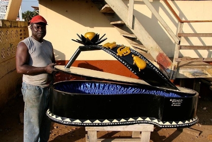 Der Sargkünstler Paa Joe mit Sandalettensarg. Foto: Regula Tschumi. Extravagante Särge bestaunt FAZ-Kritiker Florian Siebeck in der ghanaischen Haupstadt Accra. Die Angehörigen der Volksgruppe Gha, die im Süden Ghanas, in Togo und Benin lebt, hält nichts davon, ihre Toten in einfachen Holzkisten unter die Erde zu bringen. Stattdessen geben die Angehörigen bei Spezialisten Särge in Auftrag, die das Familienemblem oder den sozialen Stand des Verstorbenen verkörpern, zum Beispiel in Form einer Kobra oder eines Löwen, erfährt der Kritiker. Oft sollen die Motive aber auch einen Bezug zum Leben oder zu bestimmten Vorlieben haben: "Bis zu einem Monat dauert die Arbeit an so einer kunstvollen Hülle. Die Sargkünstler lassen sich einiges einfallen, damit die Verstorbenen ihren Weg so fortsetzen können, wie sie gelebt haben oder gern gelebt hätten. Ein Viehhändler kann in einem Rind bestattet werden, eine kinderreiche Frau in einer Henne, ein Fischer in einer Languste. Aber auch Linienbusse, Ölfässer, Bulldozer, Tomaten, Zahnpastatuben und Schnapsflaschen wurden schon gefertigt." Die ghanaische Sargkunst hat schon länger die Aufmerksamkeit der internationalen Kunstwelt erregt, so der Kritiker, Künstler wie Daniel Mensah oder Joseph Ashong alias Paa Joe zeigen ihre Särge in Museen und Ausstellung weltweit. Weitere ungewöhnliche Sargmodelle kann man hier bewundern.