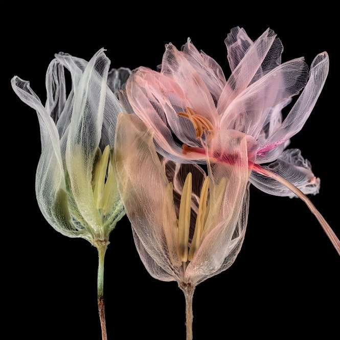 Peter Truschner besucht für sein Perlentaucher-Fotolot einige gerade laufende Ausstellungen. Mit am wichtigsten sind ihm die wunderbar ätherischen Blumenbilder Kathrin Linkersdorffs, die gerade im Berliner Haus am Kleispark zu sehen sind: "Der Arbeitsprozess ist zeitintensiv und aufwändig: Die Blumen werden aufgehängt, getrocknet, entstaubt, gewendet, besprüht, in Wasser getaucht, mit selbst hergestellter Pflanzentinte bearbeitet. 'Während des Trocknungsprozesses extrahiere ich die wasserlöslichen Pigmente der Pflanzen. Anschließend tauche ich sie in ein flüssiges Medium, in dem sie sich entfalten können. Manchmal füge ich die extrahierte Blütenfarbe hinzu, die sich in wirbelnden Ranken verteilt. Das Zusammenspiel von Farbe und Form wird zu einem Tanz, der zugleich die verborgene Alchemie aller lebenden Materie offenbart.'"