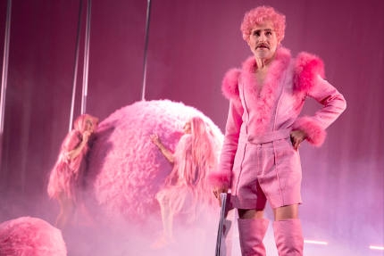 Szene aus "Munich Machine". Foto: Birgit Hupfeld Nicht besonders glücklich wirdNachtkritikerin Susanne Greiner mit Ersan Mondtags Inszenierung von Albert Ostermaiers "Munich Machine" am Münchner Residenztheater. Denn das Stück, in dem Ostermaier den Regisseur KlausLemke reinkarnieren lässt, der dabei zusieht, wie Münchner Utopien in den vergangenen Jahrhunderten scheiterten, ist zwar unglaublich witzig, aber Mondtag kriegt es nicht ganz in den Griff, so Greiner: "Weil Mondtag nicht den Faden findet, um sie stringenter zu binden. So wirken die 'Utopien' teils nur lose aneinandergereiht. An manchen Stellen hätte Mondtag den Text auch kürzen können, beispielsweise bei den beiden Anfangsmonologen von Lemke und Münchner Kindl."