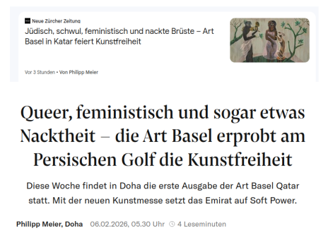 Etwas uneins ist sich die NZZ bei der Überschrift zu ihrem Artikel über die "Art Basel Katar". Bei Google News wird doch noch eine wesentlich größere Freiheit behauptet als dann im Artikel selbst auf der Website der NZZ. Die massive und nicht unbedingt kritische Berichterstattung über die Art Basel Katar erstaunt auch darüberhinaus. Warum schicken Zeitungen, die sonst so klamm sind, ihre Journalisten ausgerechnet auf die teure Reise nach Katar? Oder haben die Medien in einer gemeinsamen Investition einen Journalistenshuffle geleast?