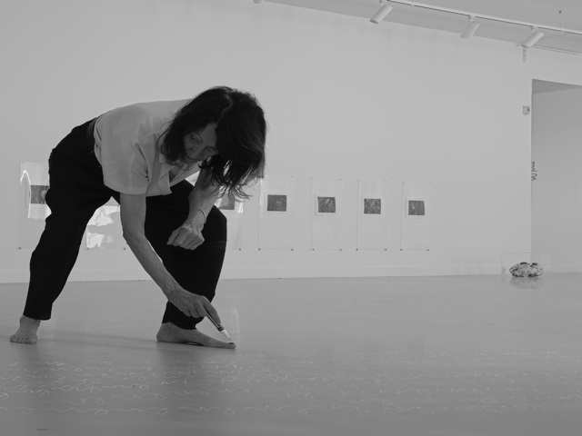 An der Wand hängen die fotografischen Dokumente dieser Meditation, wieder aus Awagami-Papier, das Korth so lange in eine Lauge taucht, trocknet, knittert und bügelt, bis es nur noch ein Hauch ist - fünf davon liegen zu Kugeln geformt auf dem Boden, der von Korth zur Eröffnung mit dem schier endlos aneinander gereihten Wort "und" vollgeschrieben wurde - ein flüchtiges Fundament, das von den Schritten der Besucher mit der Zeit verwischt und irgendwann ganz verschwunden sein wird.