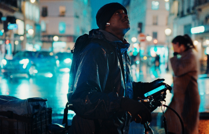 Im Film folgen wir einem Fahrrad - auf einem anderen Fahrrad. Für Einstellungen, die der Hauptfigur Souleymane auf dessen Fahrten als Fahrradkurier durch Pariser Straßen folgen, wurde die Kamera auf einem Lastenrad montiert, ist in einem Interview mit dem Director of Photography Tristan Galland zu lesen. Wir gleiten mit Souleymane in wuchtigen und doch geschmeidigen Bewegungsfolgen durch die Stadt, auf einer Route, die ihm sein Handy vorgibt: Hier bei einem Schnellrestaurant eine Bestellung abholen, da dieselbe beim Kunden abliefern, bitte noch den Code eingeben, danke, weiter zum nächsten Auftrag. Wie am Schnürchen läuft das zunächst. Für eine Weile überlassen wir uns dem Sog der nie stillstehenden Bewegungen von Menschen, Dingen, Fahrzeugen, Kapital, während sich der Abend langsam über Paris senkt. The city never sleeps. Wenn es dunkel wird in der Stadt, schauen die durch sie flitzenden Fahrräder noch ein bisschen schicker aus.