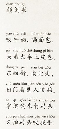 "Das heutige Gedicht ist keins, zumindest hat es keinen Verfassernamen. Es steht in einem Lesebuch für Chinesischlernende: Erste chinesische Lesestücke. Ausgewählt und übersetzt von Susanne Hornfeck und Nelly Ma. München: DTV, 2009. 2. Aufl., 2011, S. 53. Nun, es heißt Lied, es ist gereimt und metrisch (alle Zeilen außer der ersten und dritten haben sieben Silben, die beiden haben sechs mit Komma in der Mitte). Und mir gefällt es, ich lese gern Texte in mir unbekannten Sprachen. Es ist ein Kinder- oder Scherzgedicht mit einer Portion Brutalität."